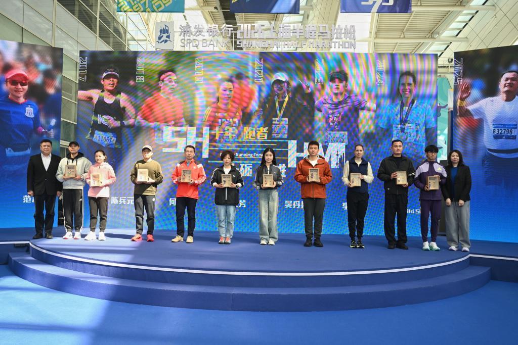而在过去十年为这场赛事默默付出努力的幕后工作者们,也来到了现场。上马组委会特别邀请了公安、裁判、志愿者、急救、医疗、PACER、环卫、工作人员、媒体、消防等十个岗位的保障代表,分享他们恪尽职守、默默奉献的故事。分享结束后,组委会为他们颁发由十位幕后英雄人偶形象组成的荣誉方阵,向十年间从未缺席的守护者致以崇高敬意。