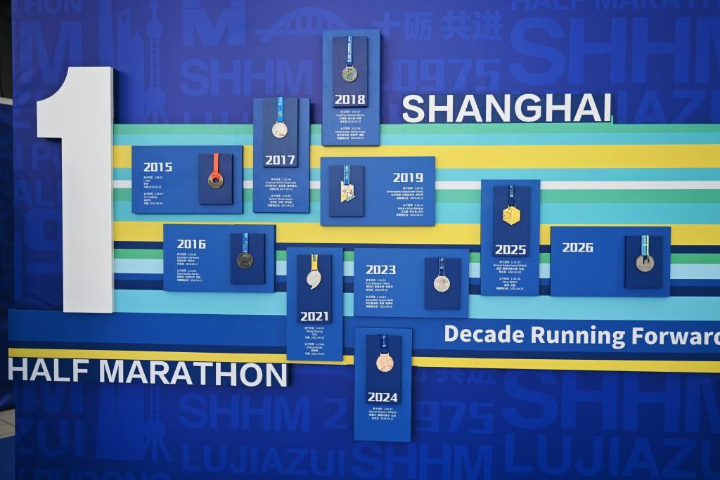 新闻发布会现场展示了过去十年上海半马的奖牌。 澎湃新闻记者 朱伟辉 摄