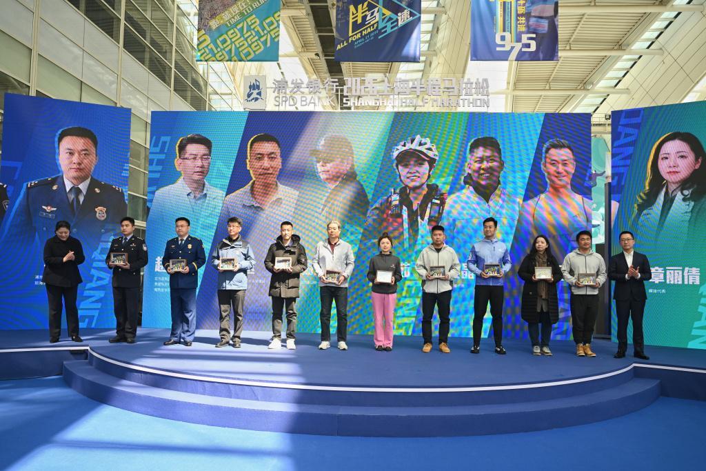 而在过去十年为这场赛事默默付出努力的幕后工作者们,也来到了现场。上马组委会特别邀请了公安、裁判、志愿者、急救、医疗、PACER、环卫、工作人员、媒体、消防等十个岗位的保障代表,分享他们恪尽职守、默默奉献的故事。分享结束后,组委会为他们颁发由十位幕后英雄人偶形象组成的荣誉方阵,向十年间从未缺席的守护者致以崇高敬意。