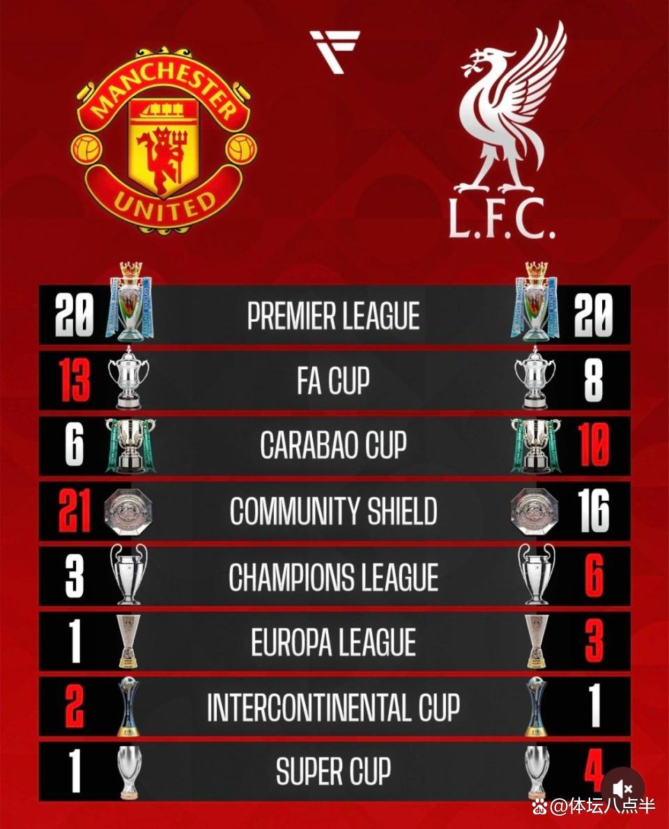 效率对比:参赛次数利物浦113季、曼联103季。曼联在少约10季的情况下仍拿到同样的20个联赛冠军,联赛效率更高;只是近年的低迷拉低了体感。